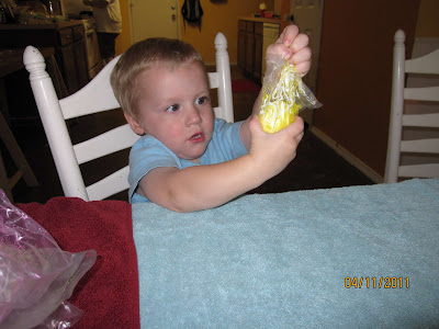 I saw this egg kit at Wal-mart and figured this would be the less mess option for Lucas... |